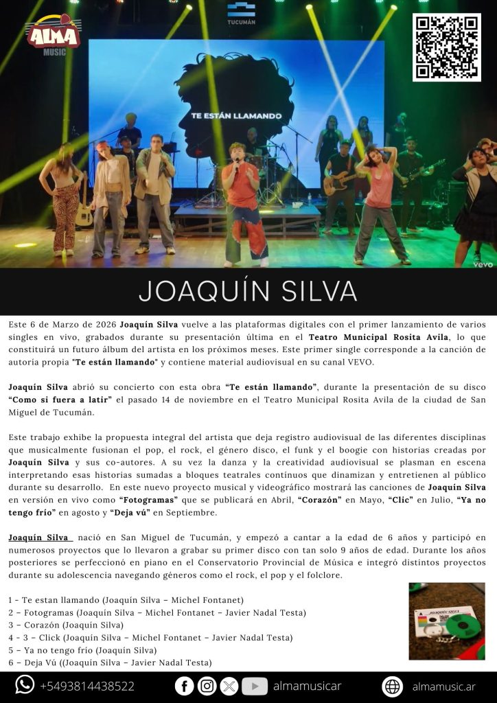 Joaquín Silva Plataformas 12 septiembre 202513 abril 2026Gonzalo Soraire HAZ CLIC PARA ESCUCHAR Spotify Deezer Youtube Descargas Biografía Linktr.ee Joaquín Silva hará un showcase en Panda Club Joaquín Silva llega al Teatro Municipal Rosita Avila Facebook Twitter LinkedIn WhatsApp Messenger Email